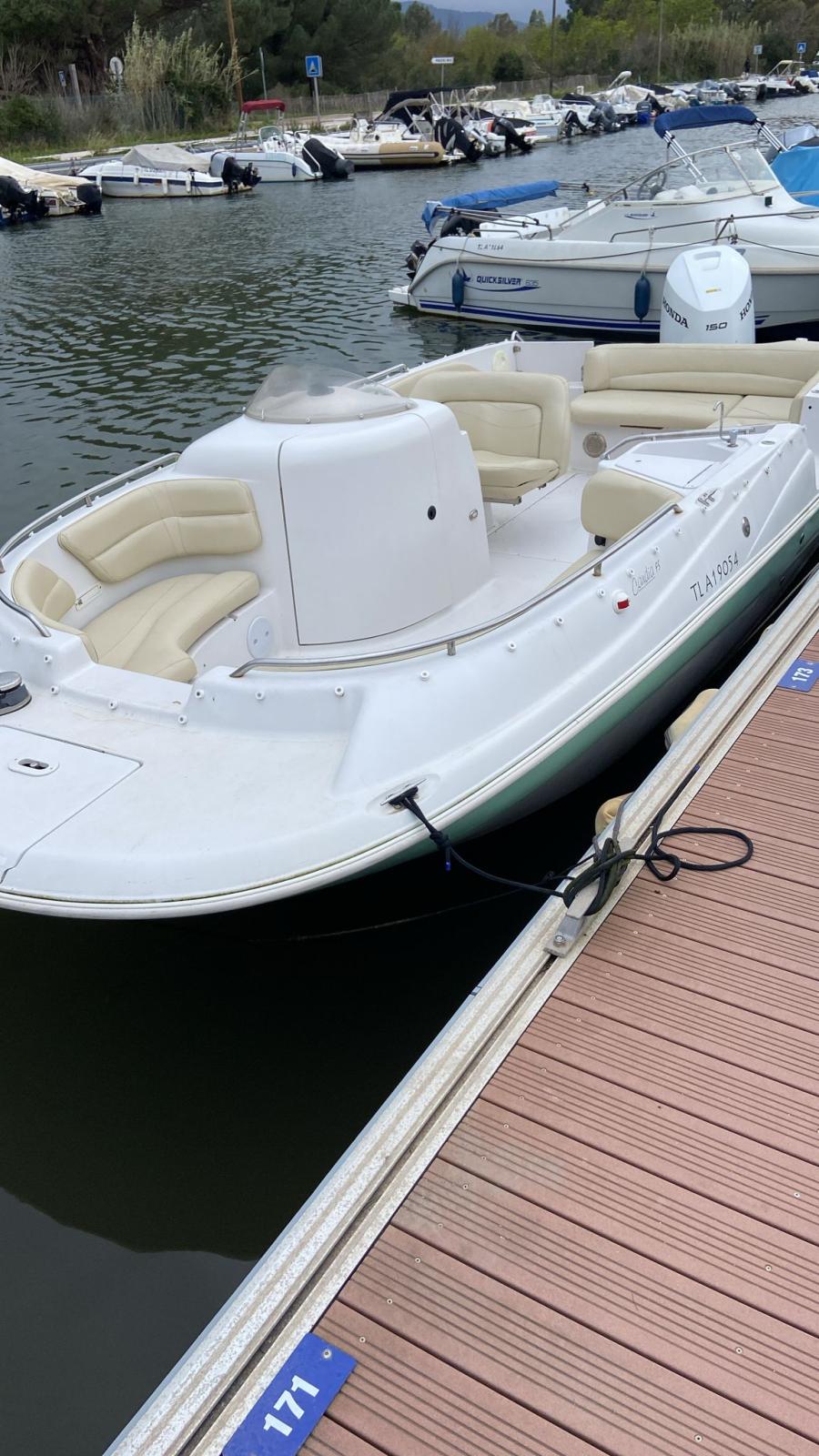 La motorisation a également été renouvelée en 2023 avec l’installation d’un moteur Honda BF150 de 150 chevaux. Ce moteur hors-bord moderne et fiable totalise seulement 130 heures de fonctionnement. Il offre de très bonnes performances pour un bateau de cette taille, avec une vitesse de croisière confortable autour de 24 nœuds et une vitesse maximale pouvant approcher les 40 nœuds. Cette motorisation assure également une consommation raisonnable et un entretien simplifié.