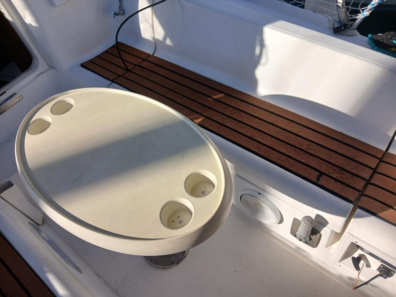 Le cockpit extérieur est spacieux pour un voilier de cette taille et permet de profiter pleinement de la navigation et des mouillages. Les banquettes offrent un espace confortable pour l’équipage.