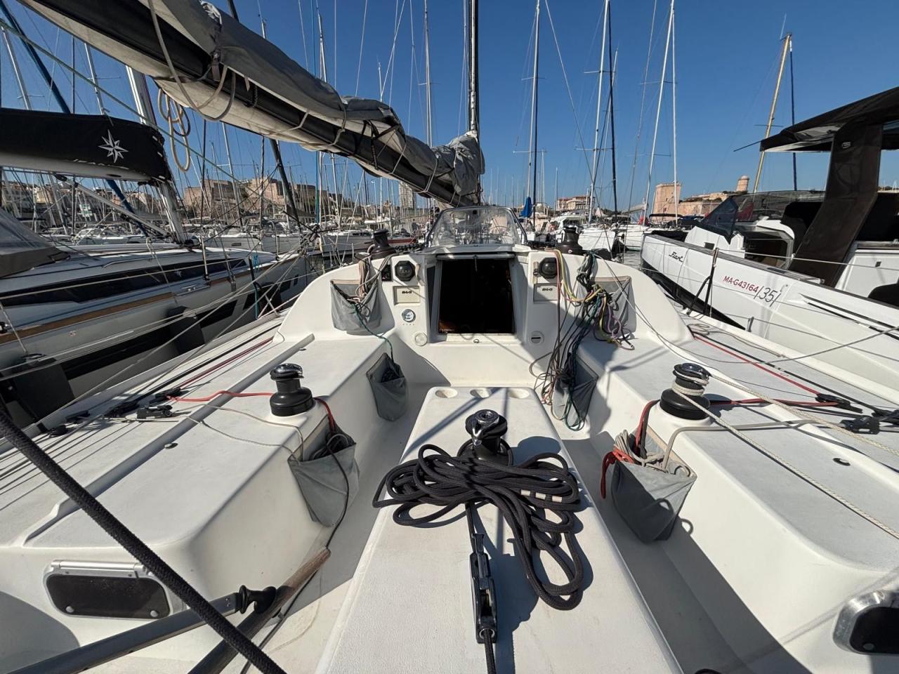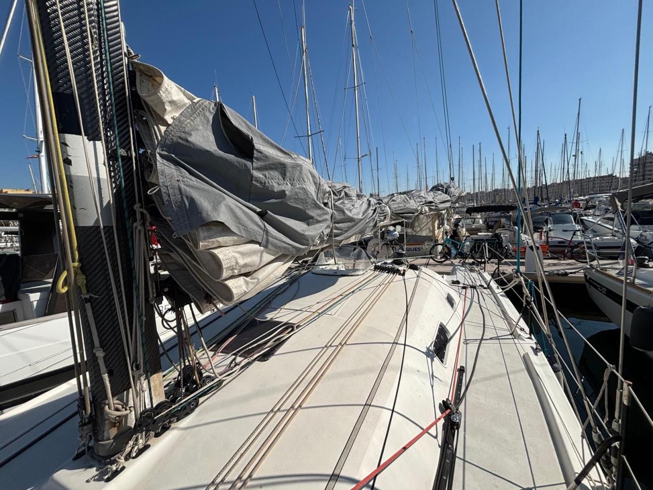Deux barres franches pour un contrôle précis en navigation. Électronique complet incluant radar, idéal pour la navigation hauturière. Gréement performant avec mât carbone, bôme aluminium et 7 voiles de course. Excellente autonomie énergétique : hydrogénérateur Watt&Sea 600W, panneaux solaires, convertisseur, dessalinisateur.