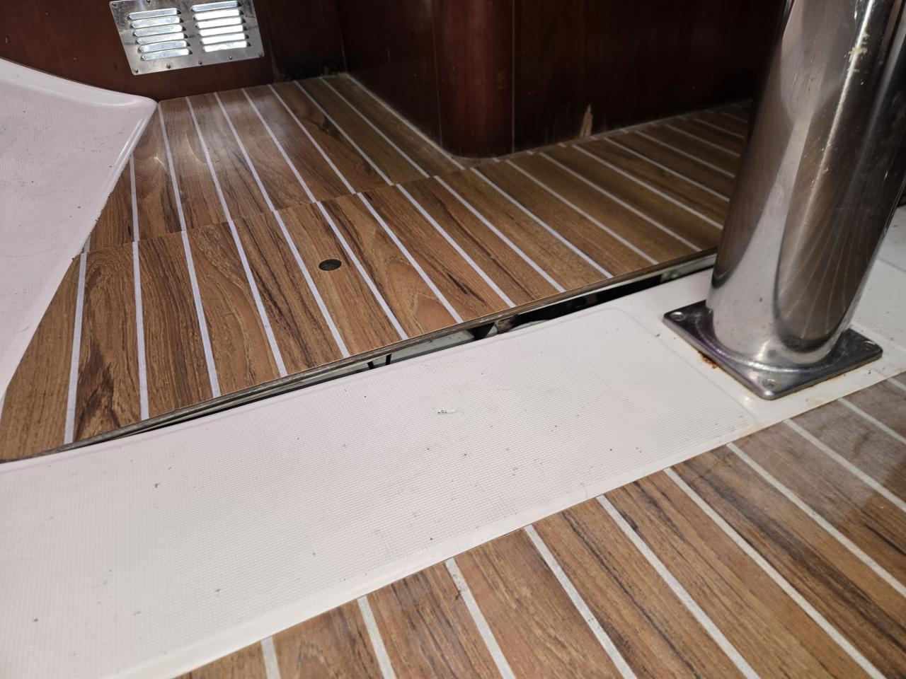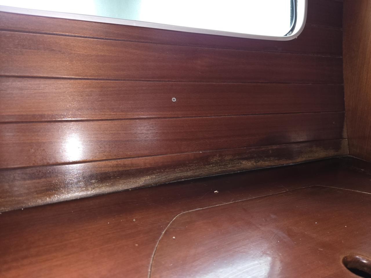 Avant de visiter le bateau, sachez qu'il y a quelques points à réparer : deux planches du plancher intérieur sont déformées, certains revêtements muraux sont à remplacer, il semble que de l'eau se soit infiltrée par un houblor, et certains couvercles de coffres ainsi que la table à cartes doivent être revissés.