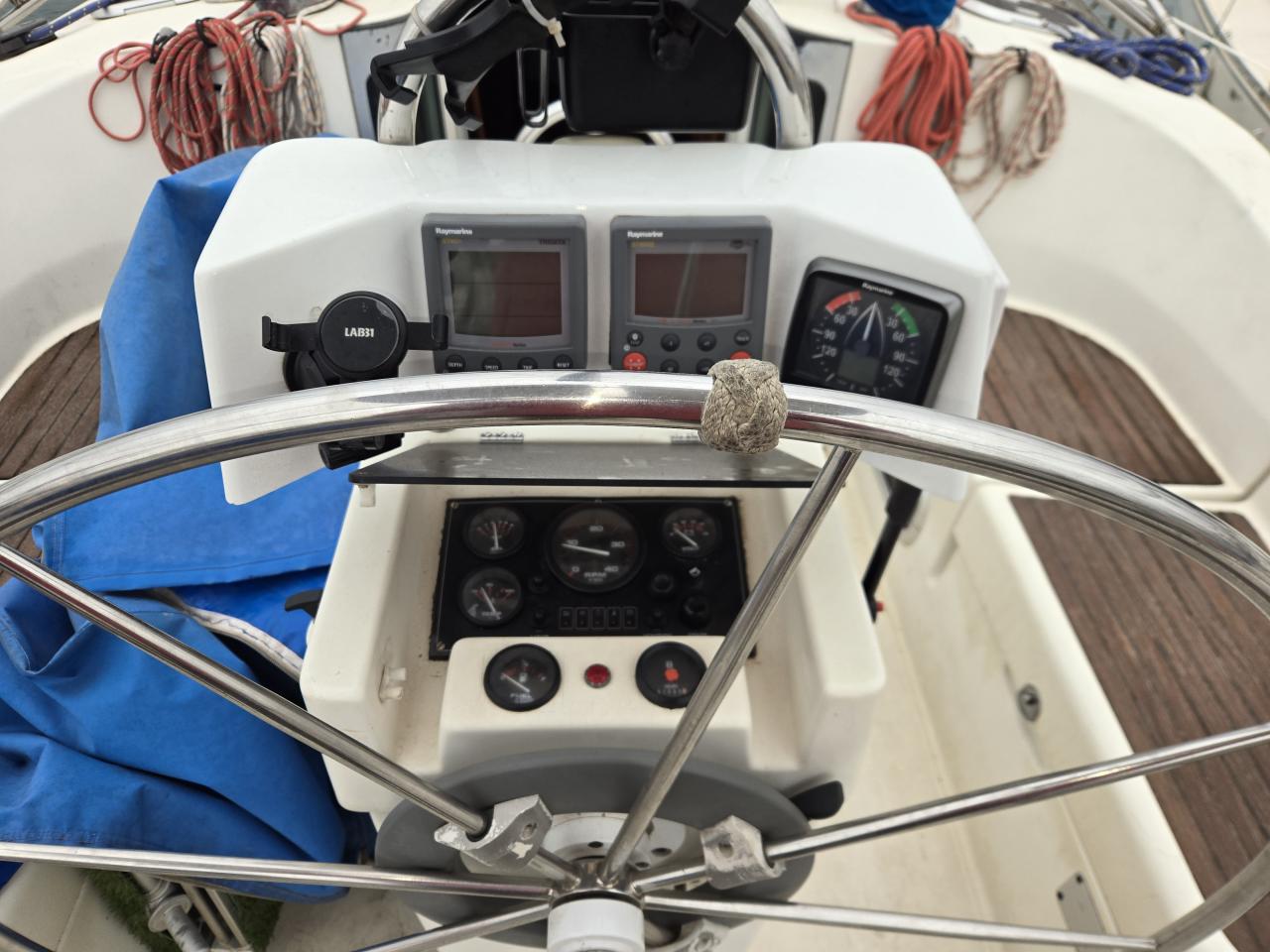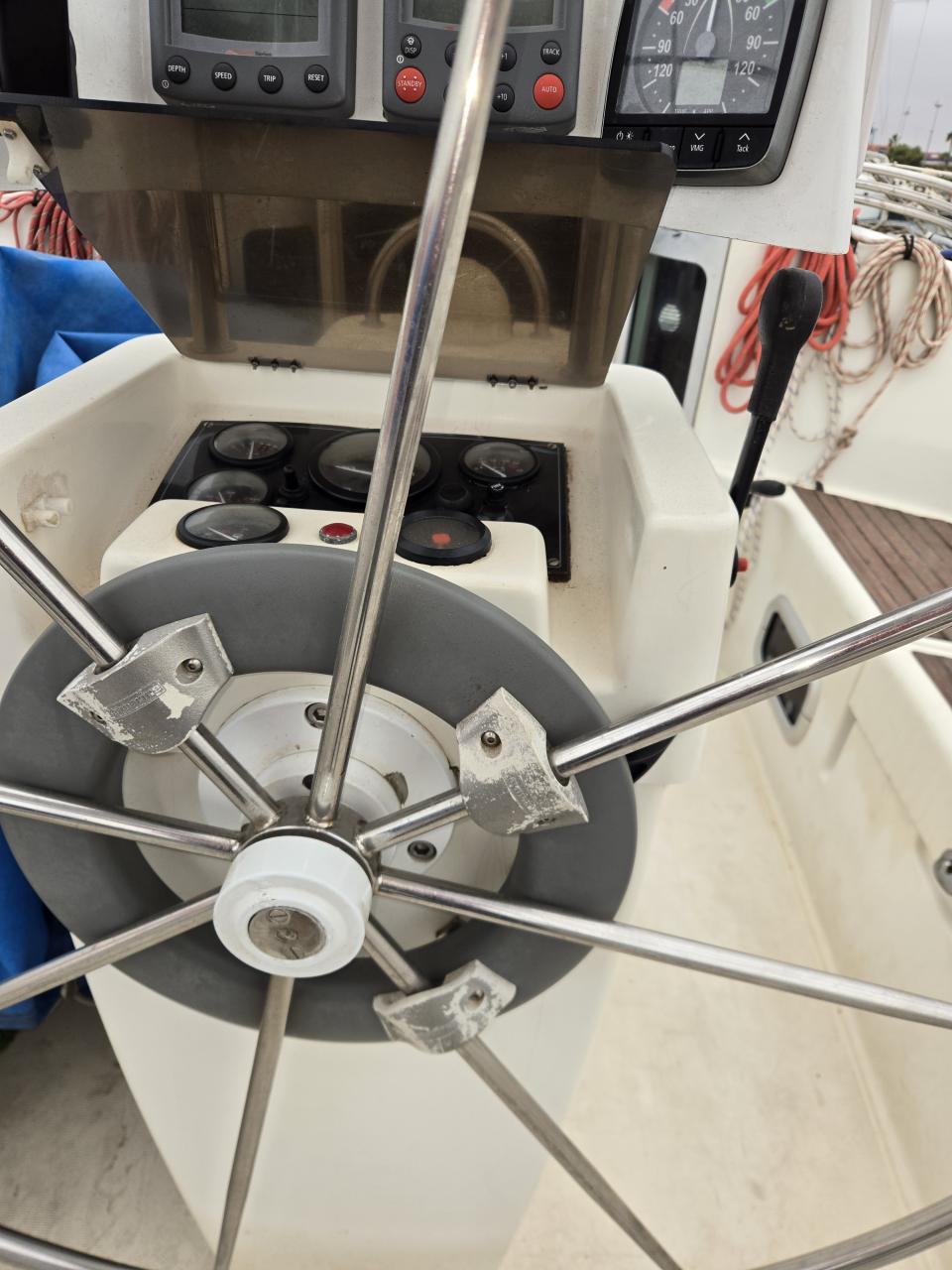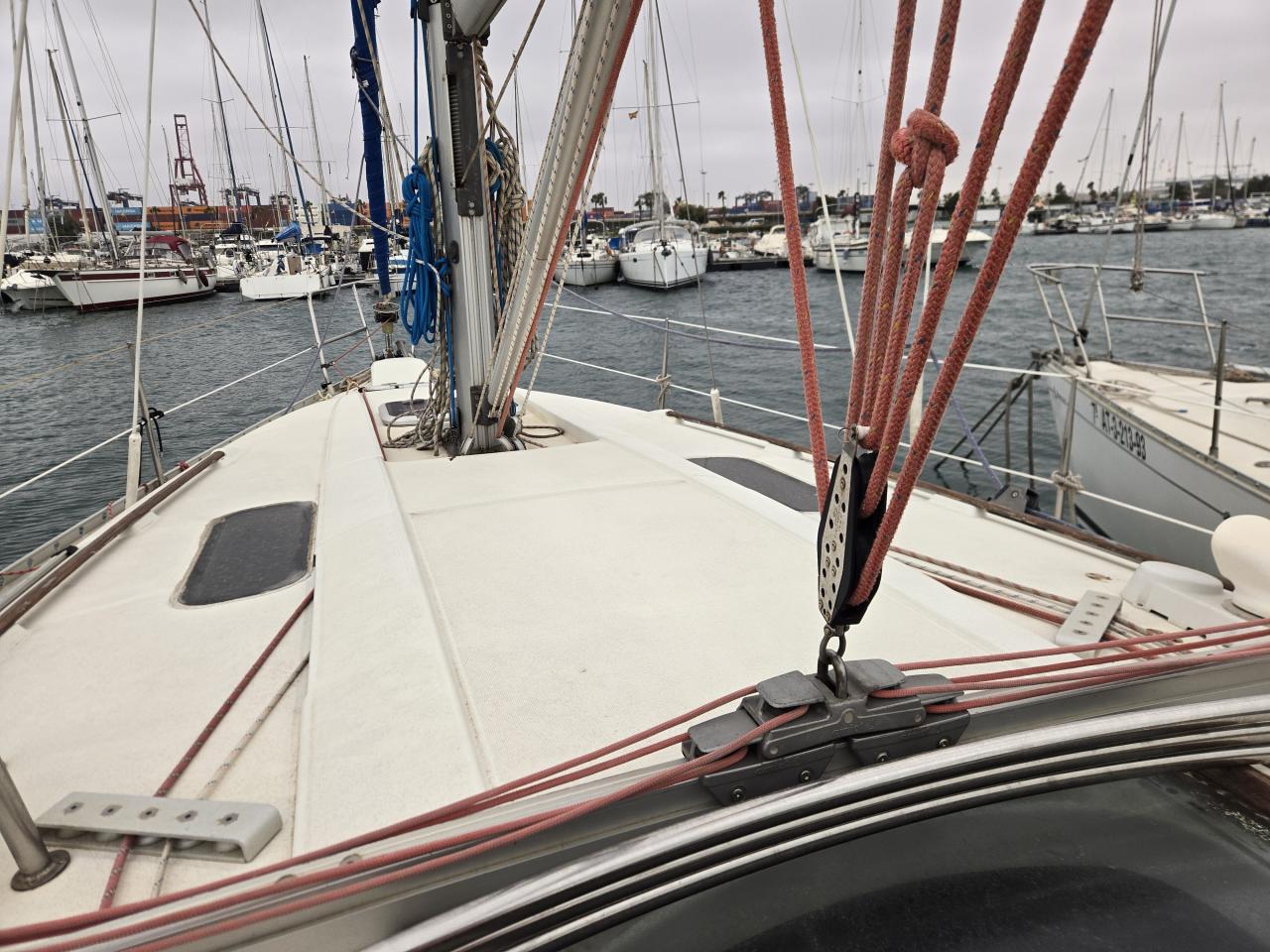 Sur le pont, une partie de la poupe nécessite une réparation de la fibre de verre. Quelques drisses sont à remplacer. Les butées de pont doivent également être remplacées.