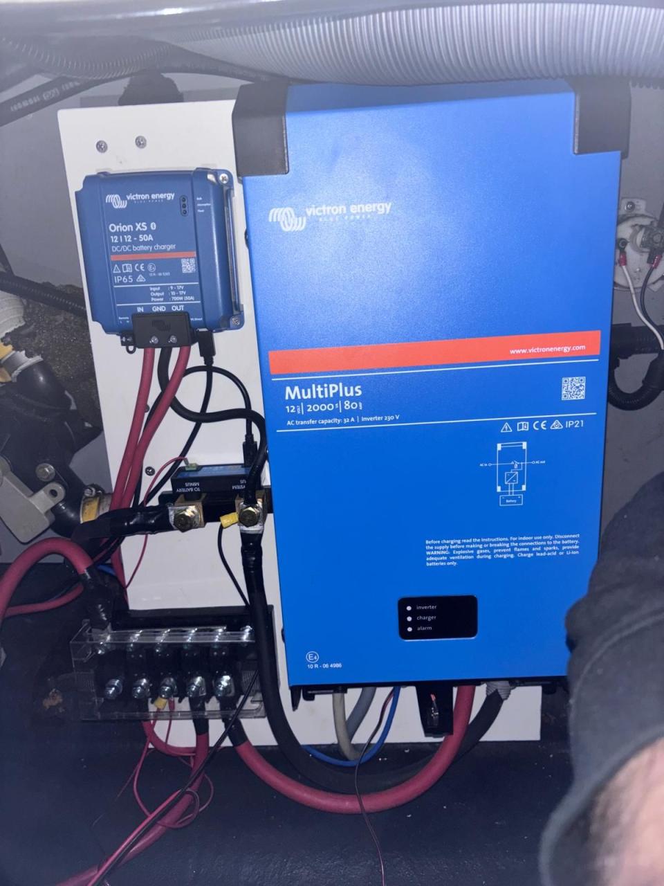 L’un des points forts de cette unité réside dans son niveau d’équipement particulièrement complet. Le système électrique a été modernisé avec des batteries lithium LiFePO4 et un convertisseur Victron Multiplus, permettant de disposer du 220 volts à bord de manière autonome. Ce type d’installation améliore considérablement le confort lors des mouillages prolongés.