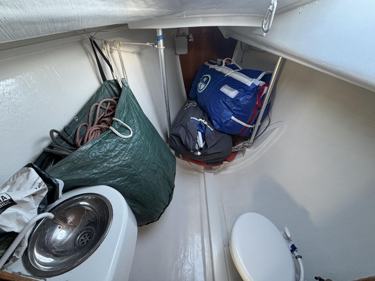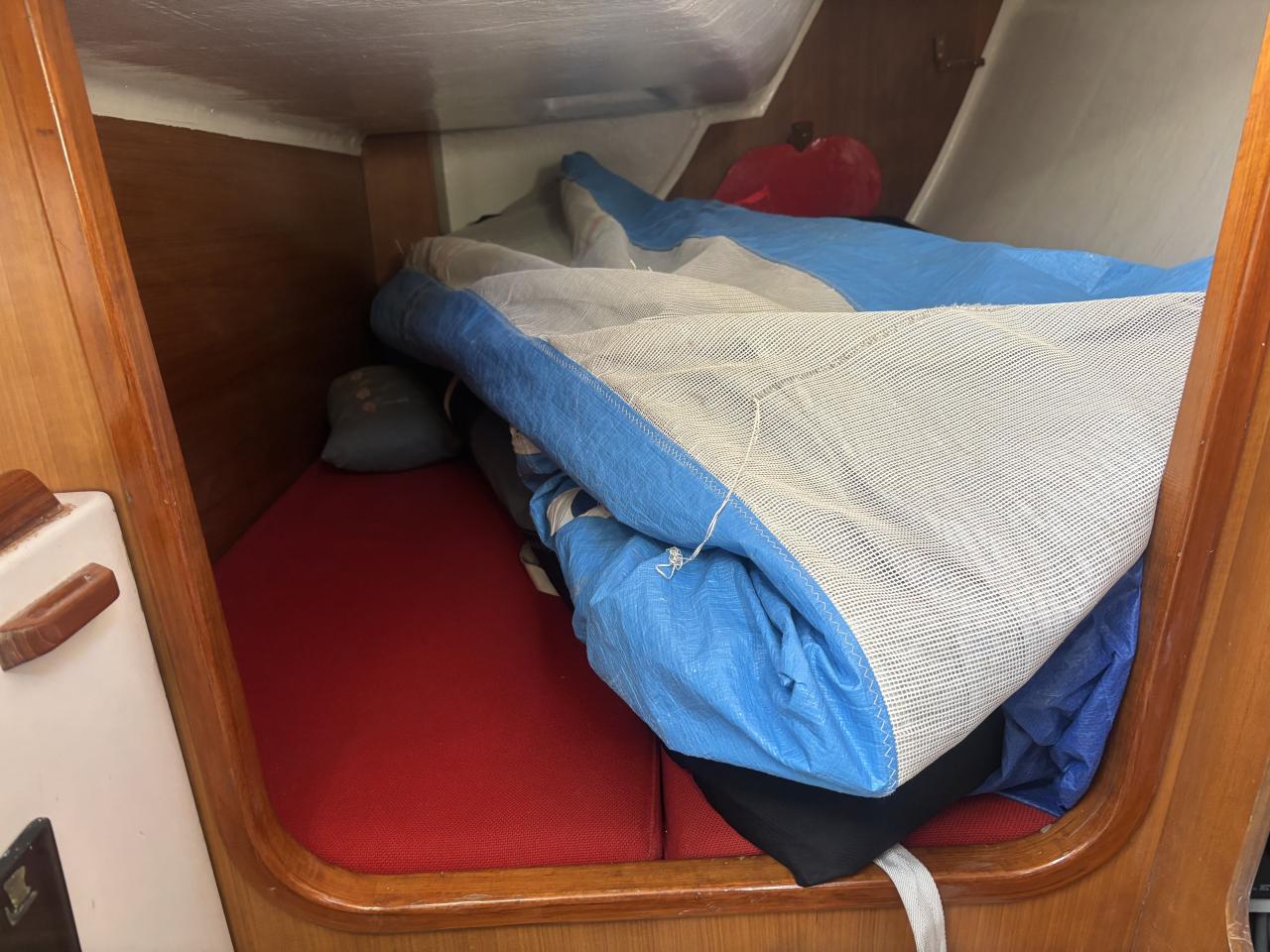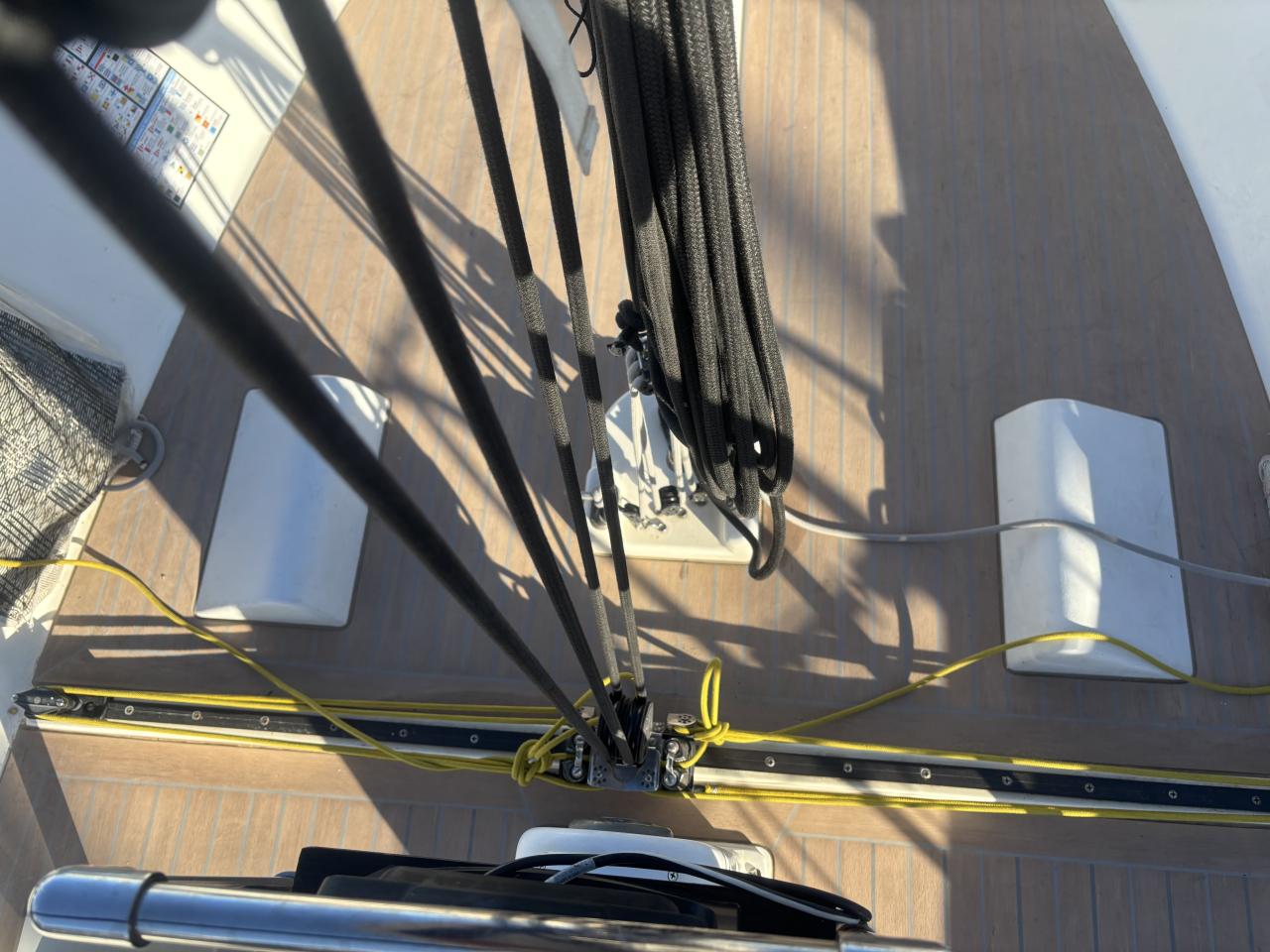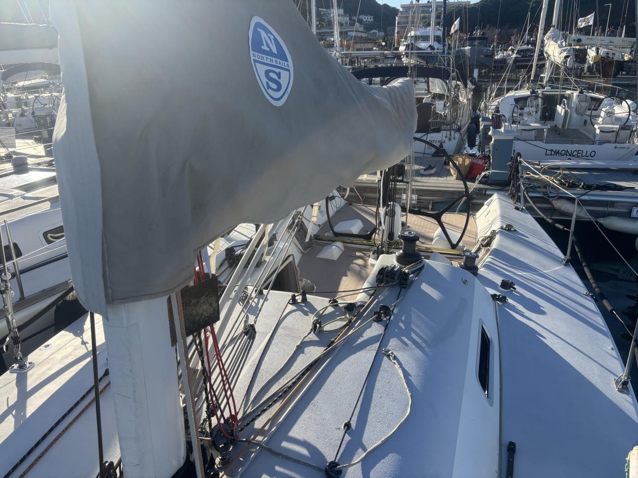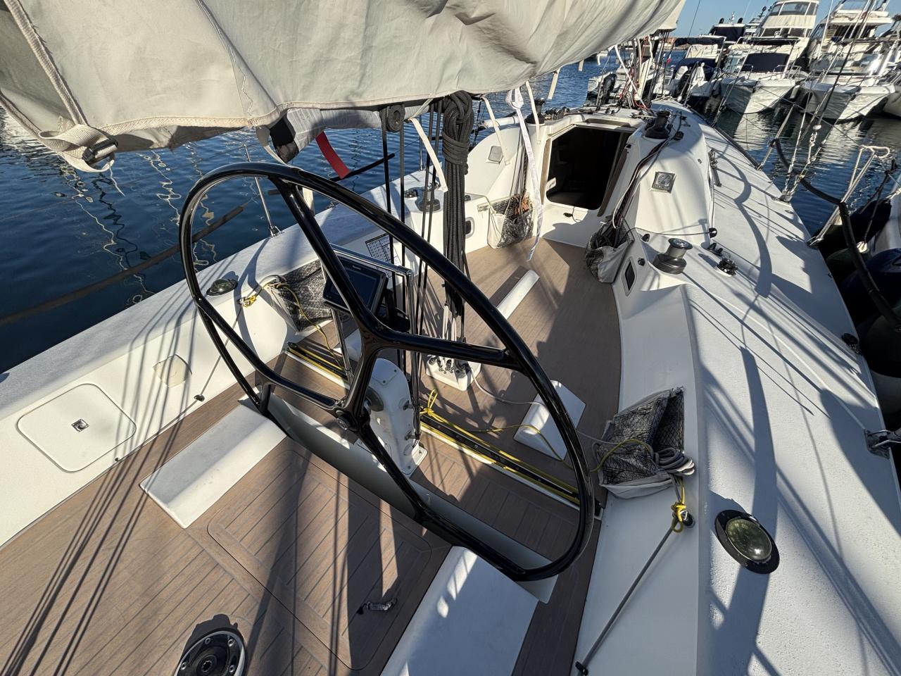 Très beau jeu de voiles incluant voiles de régate récentes North et Doyle (2023–2024), spinnakers asymétriques et symétrique, ainsi qu’un Code Zero. Voiles de croisière également disponibles dont grand voile North 3DI et génois.