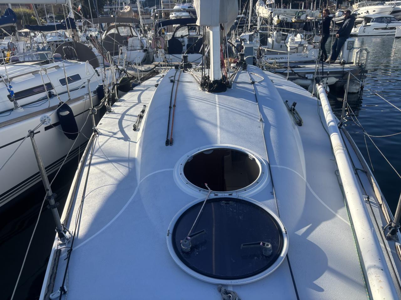Voilier 36 OD de 2003 optimisé pour la régate et la croisière rapide, équipé d’un mât et d’une bôme carbone Pauger, gréement Dyneema récent et accastillage complet avec winchs Harken, bout dehors et tangon carbone.
