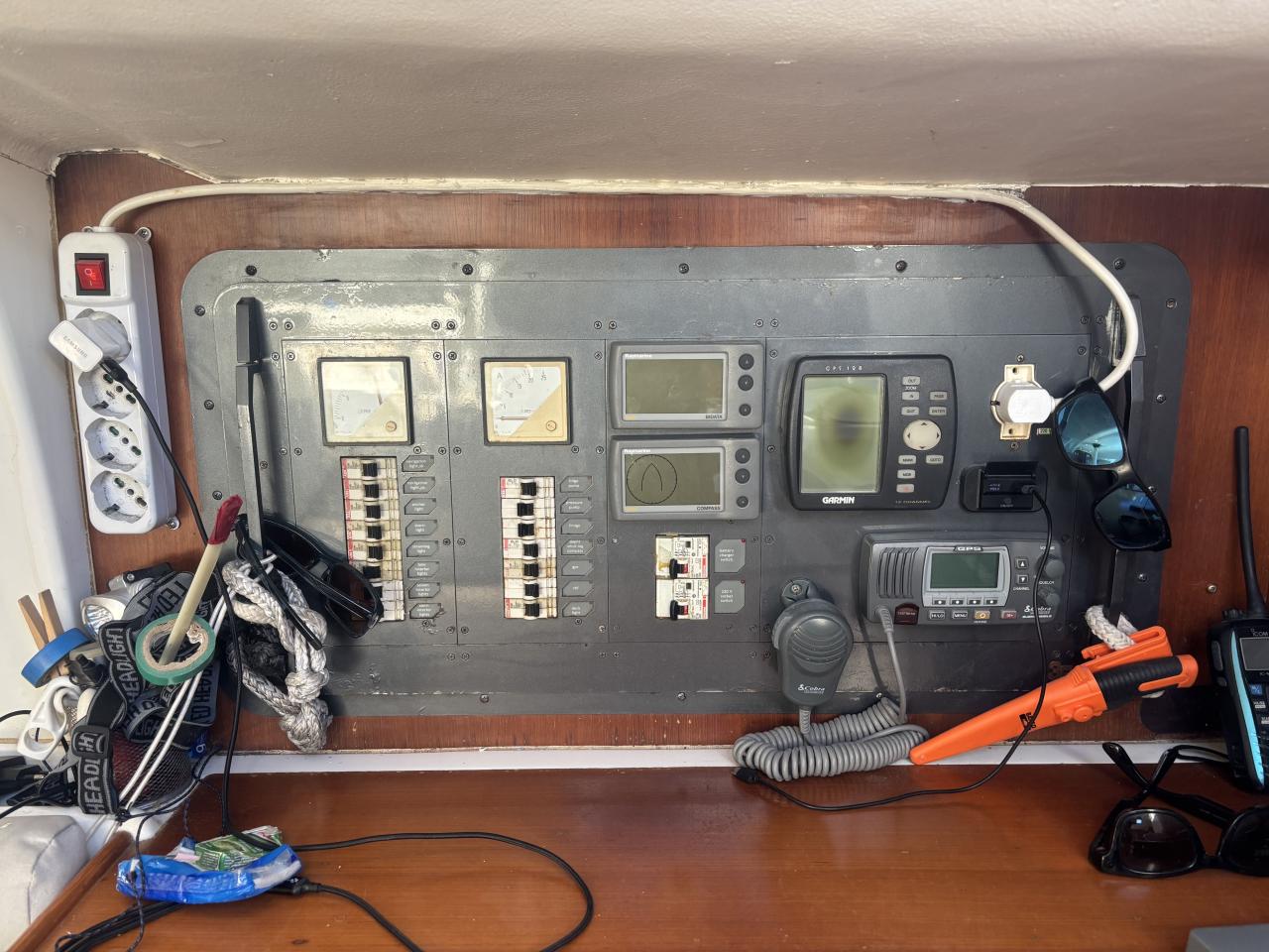 Électronique Raymarine complète (GPS, pilote ST7000, loch, sondeur, anémomètre) et VHF fixe + portable.