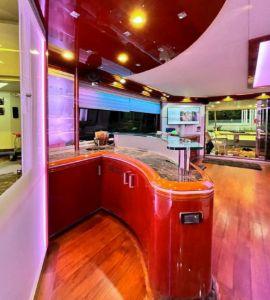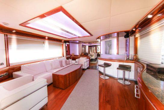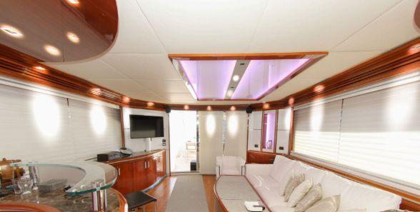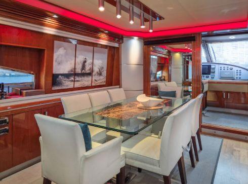 Le salon principal est spacieux et lumineux, avec un espace salle à manger et un salon élégant, créant une atmosphère conviviale et raffinée. La cuisine entièrement équipée permet une utilisation prolongée en croisière avec un haut niveau de confort.