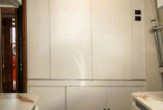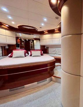 L’aménagement intérieur est pensé pour accueillir jusqu’à 8 invités dans des conditions luxueuses. Le yacht dispose d’une cabine propriétaire pleine largeur offrant un espace exceptionnel avec salle de bains privative. Une cabine VIP à l’avant ainsi que deux cabines twin complètent l’espace nuit, chacune avec sa propre salle de bains. Une zone dédiée à l’équipage permet d’accueillir jusqu’à 4 personnes.