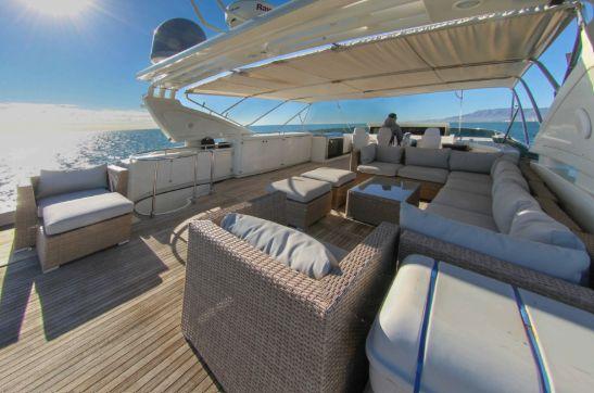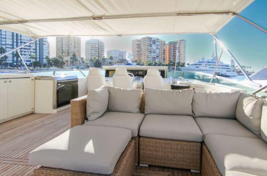 Les espaces extérieurs sont un véritable atout. Le flybridge propose un grand salon avec table pour 8 personnes, un barbecue, une cuisine extérieure et un espace bain de soleil. Le cockpit arrière permet de profiter de repas en plein air avec un accès direct à la plateforme de bain hydraulique, idéale pour les activités nautiques.