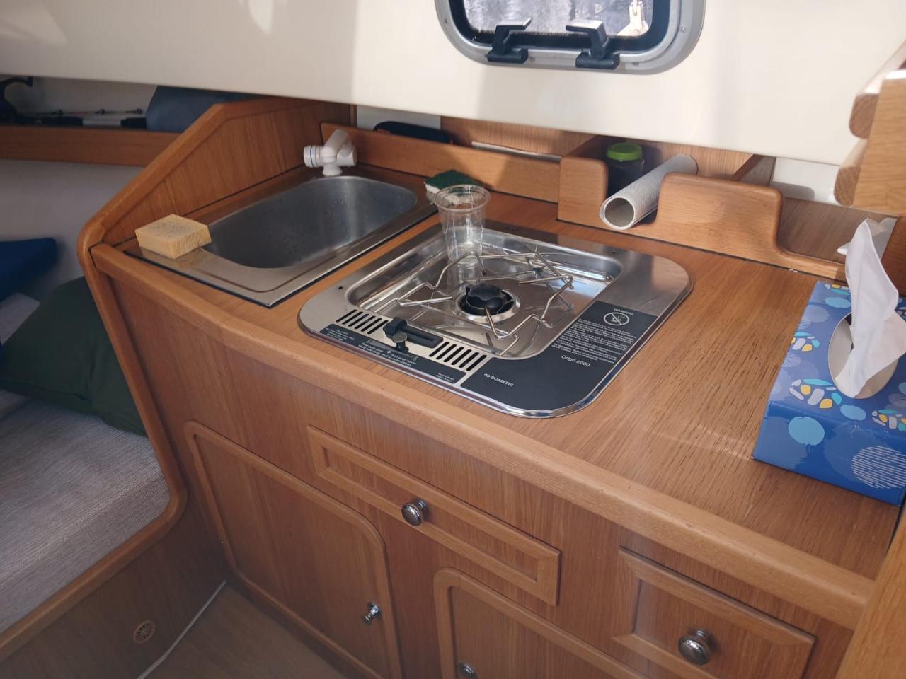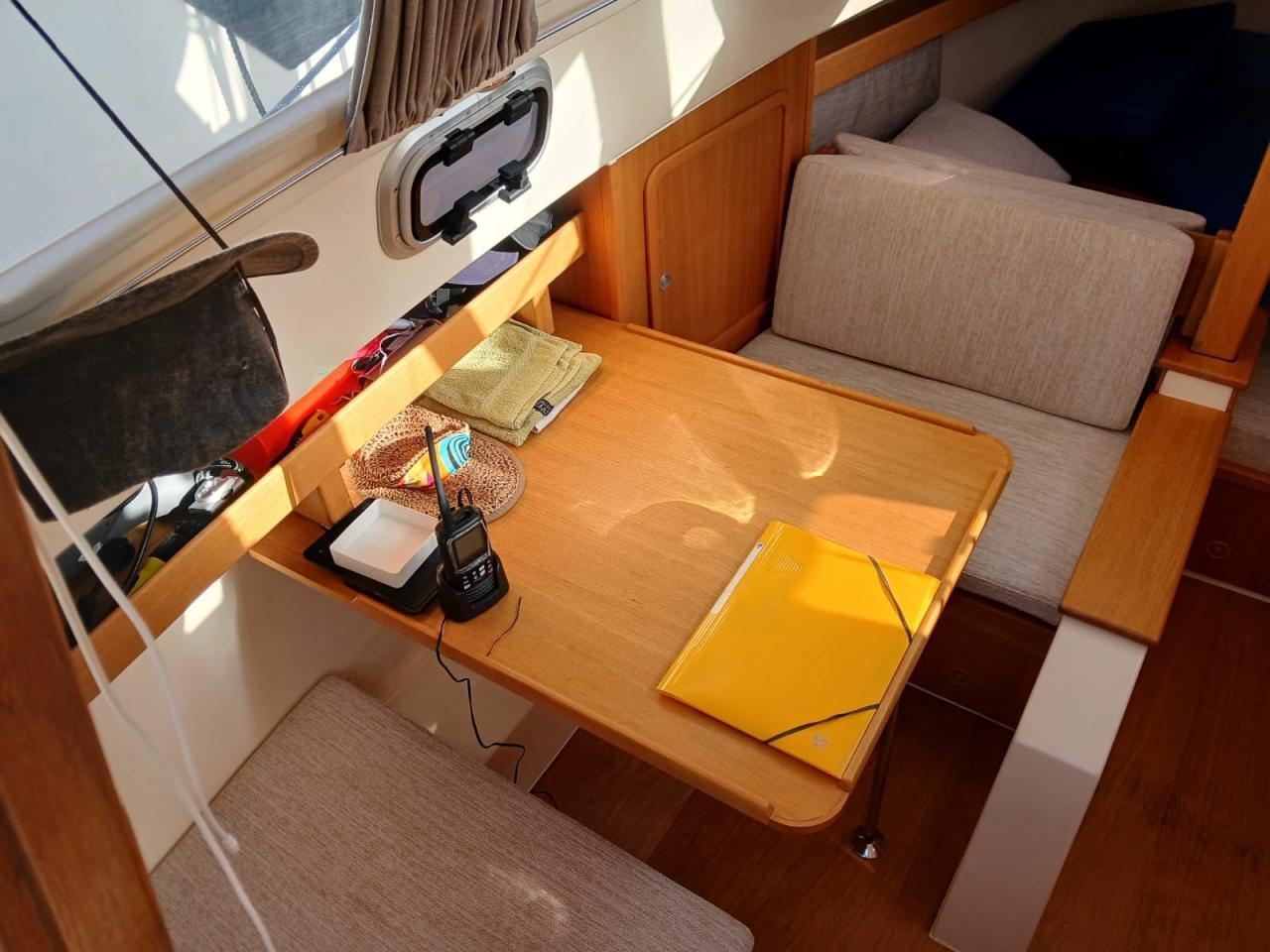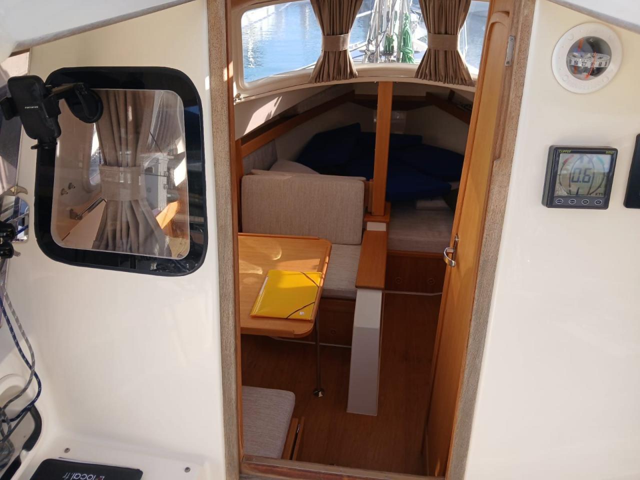 L’aménagement intérieur est remarquablement optimisé pour un voilier de cette taille. Il propose quatre couchages confortables, dont une véritable cabine double fermée, un carré transformable, ainsi qu’une salle de bains avec WC. La cuisine est équipée d’un réfrigérateur et de plaques gaz, permettant une réelle autonomie à bord pour les week-ends ou les croisières côtières prolongées. La luminosité intérieure, la hauteur sous barrots et les nombreux rangements renforcent le confort de vie à bord.