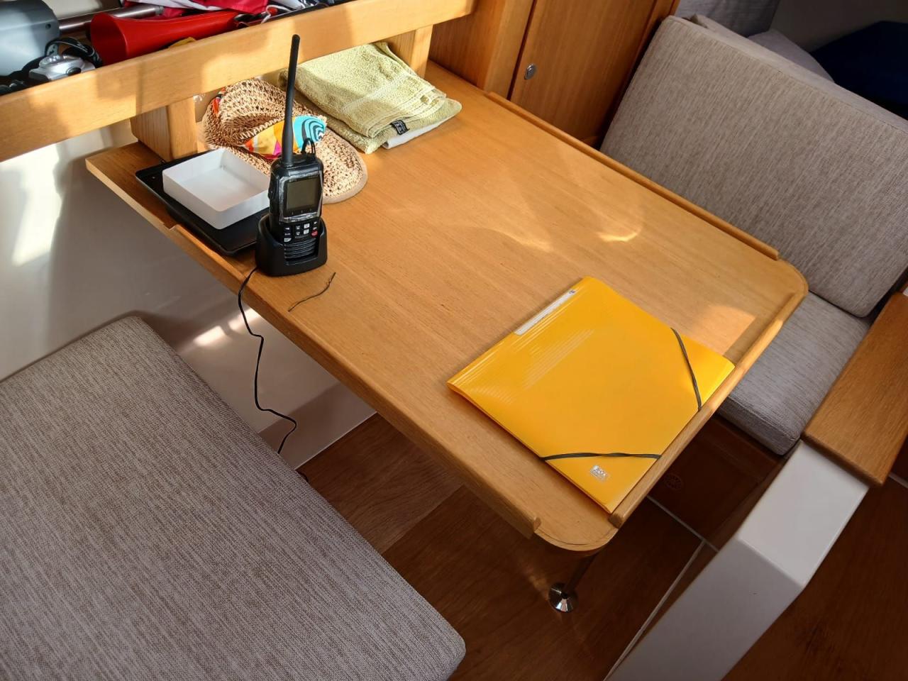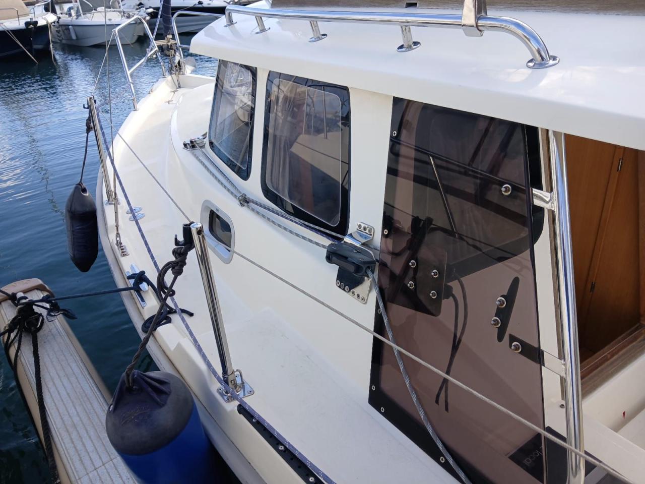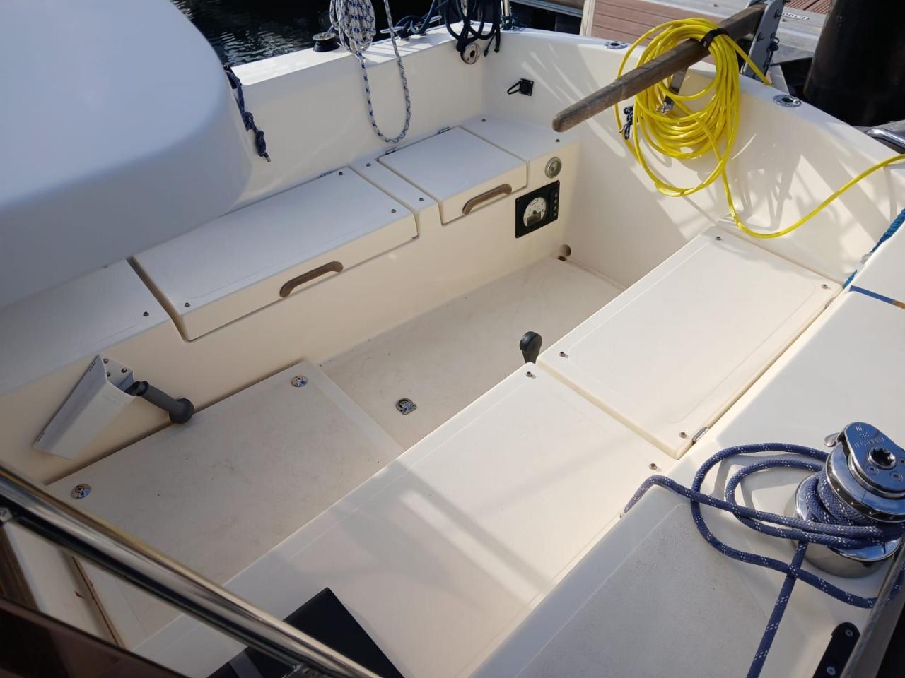 L’aménagement intérieur est remarquablement optimisé pour un voilier de cette taille. Il propose quatre couchages confortables, dont une véritable cabine double fermée, un carré transformable, ainsi qu’une salle de bains avec WC. La cuisine est équipée d’un réfrigérateur et de plaques gaz, permettant une réelle autonomie à bord pour les week-ends ou les croisières côtières prolongées. La luminosité intérieure, la hauteur sous barrots et les nombreux rangements renforcent le confort de vie à bord.