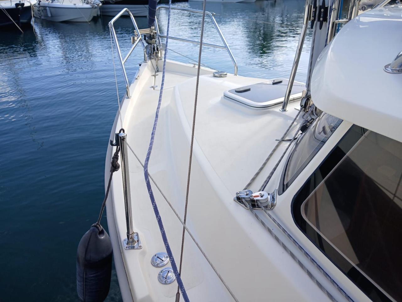 Côté propulsion, le Haber 660 est motorisé par un Yanmar de 15 chevaux affichant seulement 110 heures, reconnu pour sa fiabilité, sa sobriété et sa facilité d’entretien. La navigation est facilitée par un équipement électronique complet comprenant un GPS traceur, une centrale vent, une VHF et un pilote automatique, offrant sécurité et sérénité en mer comme au port. L’alimentation 220 V à quai complète l’ensemble pour un usage confortable.