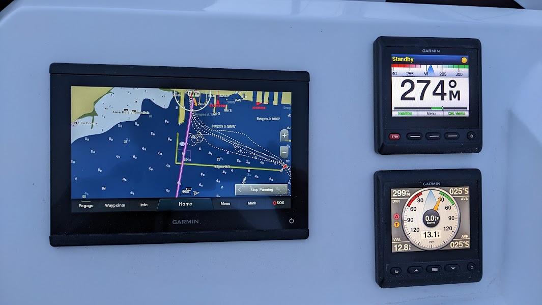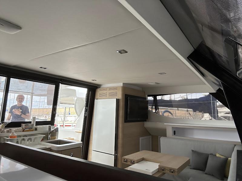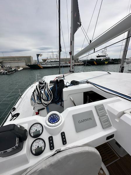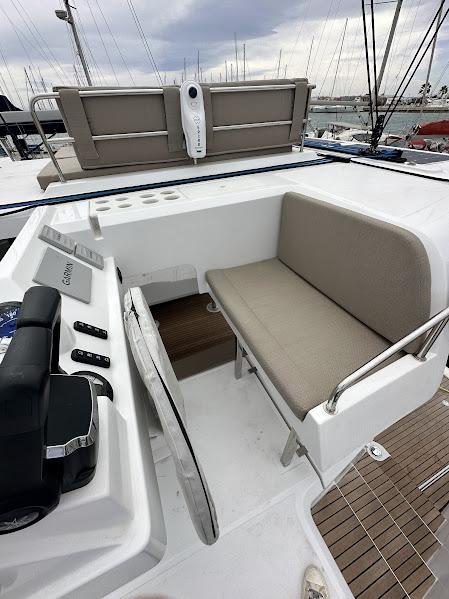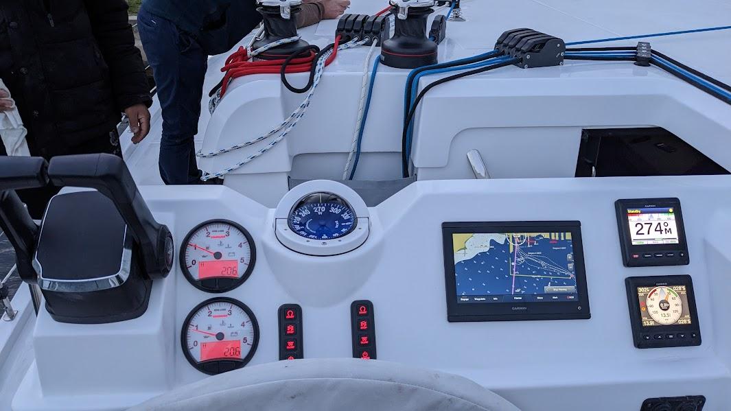 Tout la navigation est centralisé à la barre, mais l'électronique et le moteur sont séparés des commandes de voiles, ce qui rend la navigation très confortable. La visibilité est excellente. Ce catamaran intelligent offre la possibilité d'être piloté depuis l'écran extérieur, l'écran intérieur ou manuellement.