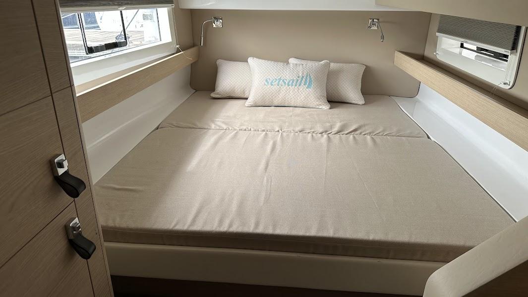 Les espaces sont lumineux et bien agencés pour une movilité aisée, vous permettant de rester en contact avec vos passagers tout en cuisinant ou en pilotant. Différents espaces indépendants sont également disponibles : un bain de soleil à l'avant, un flybridge et une table extérieure.