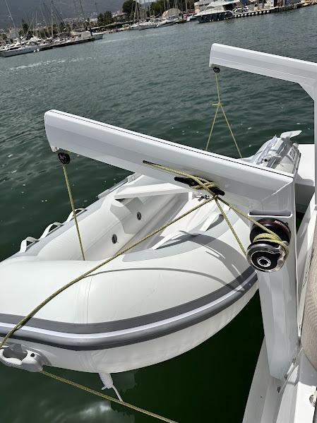 Le cockpit extérieur est spacieux et dispose d'une table et de sièges pour tous les passagers. À l'arrière, une plaque de cuisson à gaz permet de cuisiner du poisson frais ou tout autre plat de votre choix. L'annexe est sécurisée par des bossoirs.