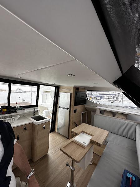 Tout la navigation est centralisé à la barre, mais l'électronique et le moteur sont séparés des commandes de voiles, ce qui rend la navigation très confortable. La visibilité est excellente. Ce catamaran intelligent offre la possibilité d'être piloté depuis l'écran extérieur, l'écran intérieur ou manuellement.