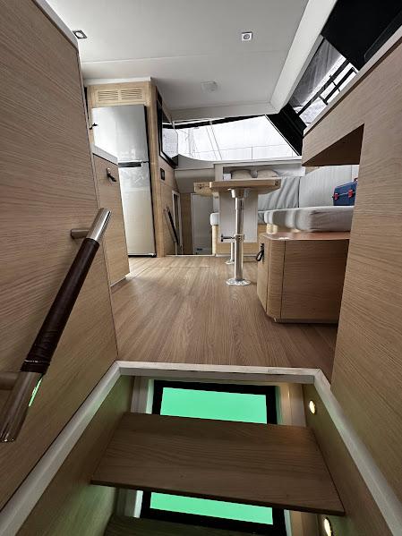 Les espaces sont lumineux et bien agencés pour une movilité aisée, vous permettant de rester en contact avec vos passagers tout en cuisinant ou en pilotant. Différents espaces indépendants sont également disponibles : un bain de soleil à l'avant, un flybridge et une table extérieure.